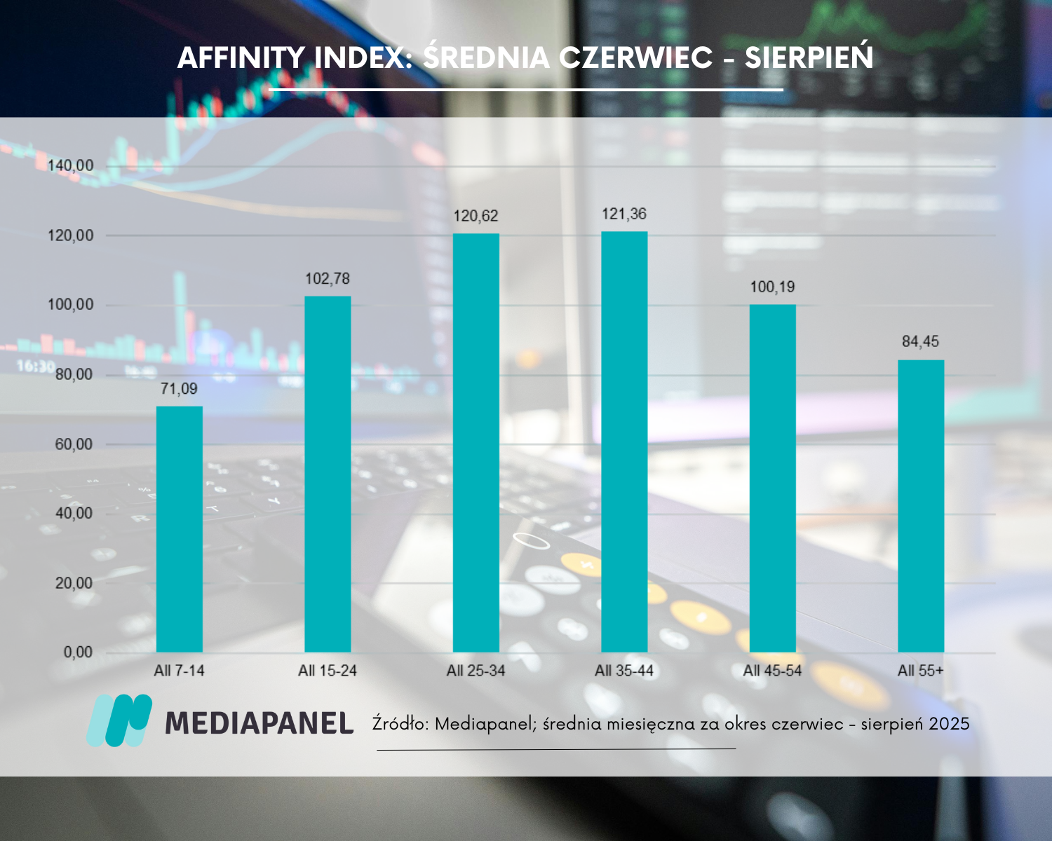 Potwierdza to średni miesięczny wskaźnik Affinity Index. W grupach 25–34 i 35–44 wynosi on średnio ok. 120, co oznacza nadreprezentację użytkowników w tym wieku względem całej populacji. Innymi słowy, dla użytkowników z tych kohort istnieje wyraźnie wyższe prawdopodobieństwo korzystania z aplikacji finansowych, niż w przypadku średniej.