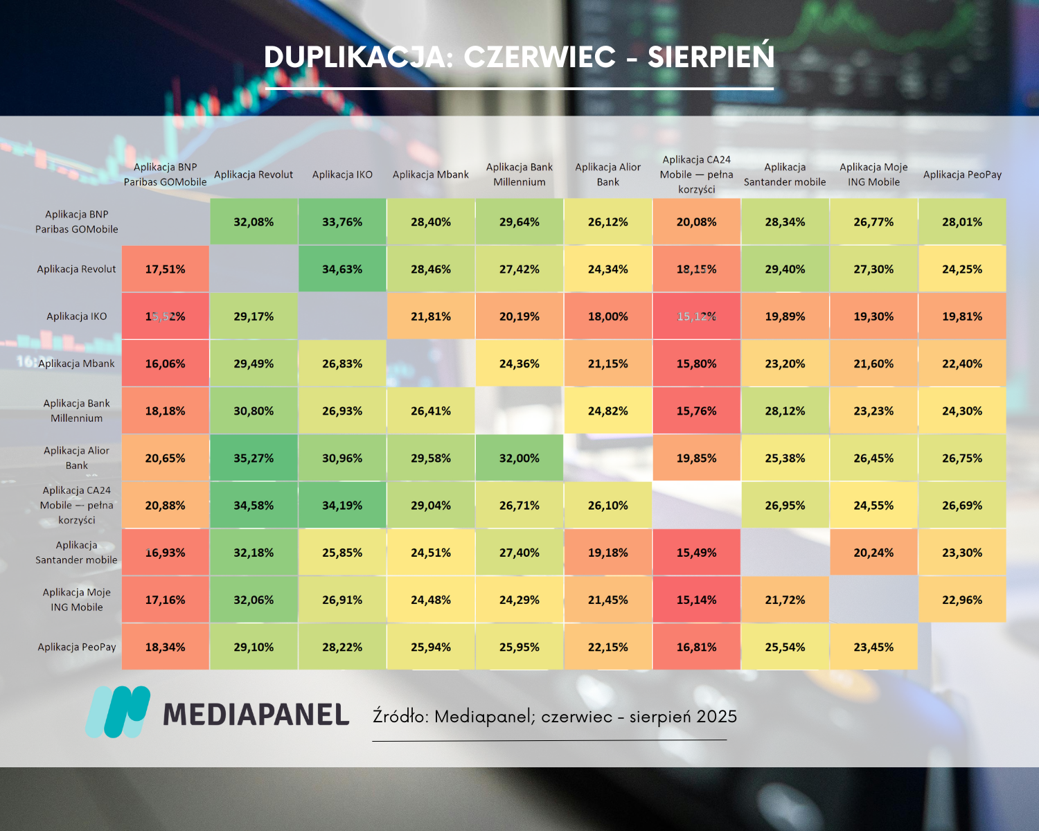 Dla większości aplikacji bankowych udział użytkowników, którzy korzystają również z Revoluta, przekracza 30%. Rekord pada w przypadku Alior Banku, gdzie duplilkacja ta w miesiącach czerwiec–sierpień wyniosła ponad 35%.