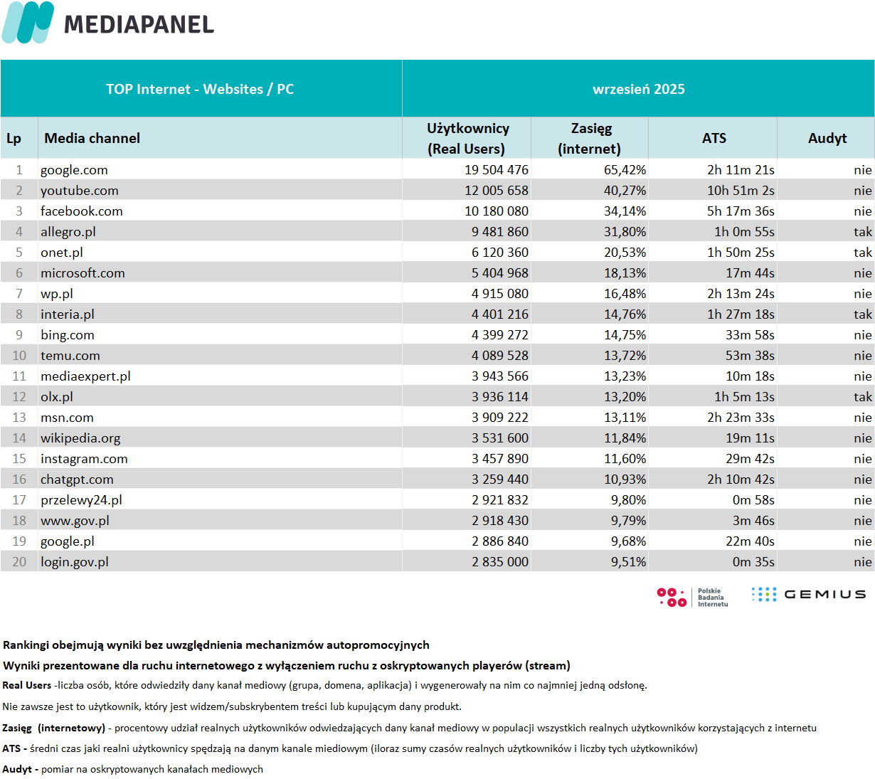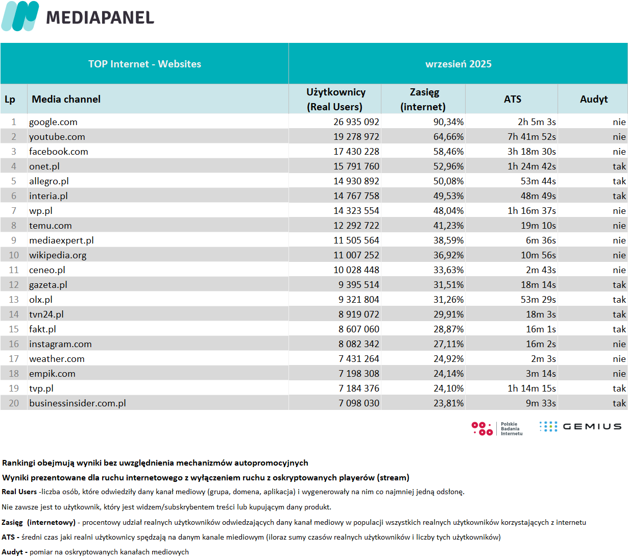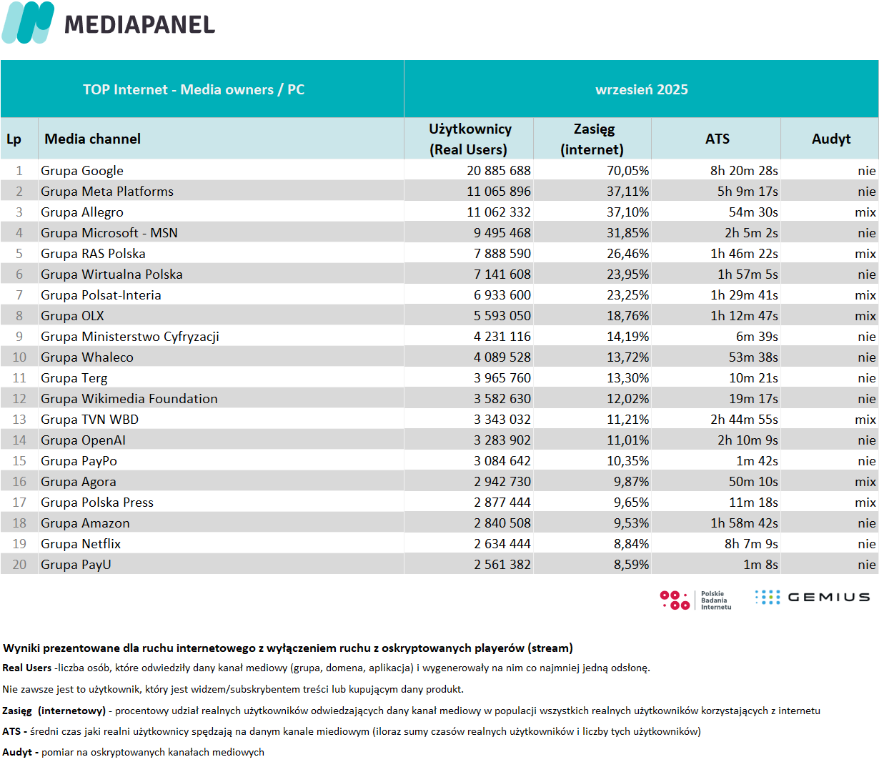 We wrześniu liczba internautów wyniosła 29,6 mln. Średnio dziennie korzystało z tego medium 26,2 mln osób.