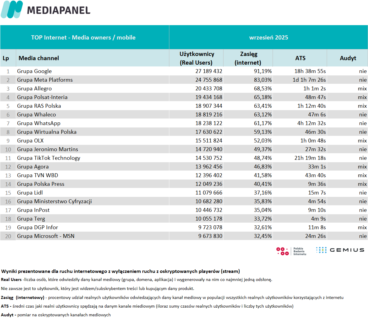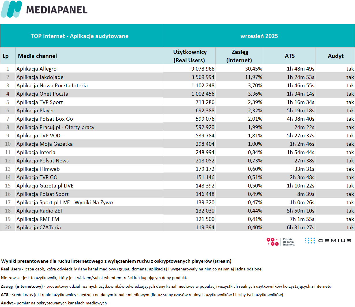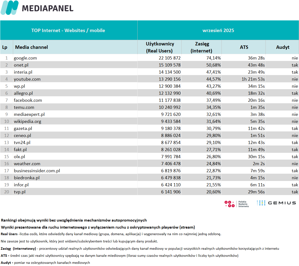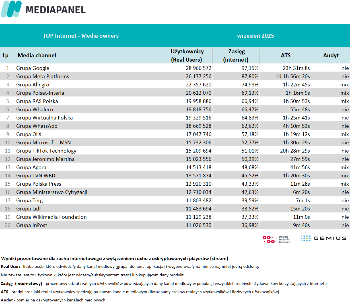 We wrześniu liczba internautów wyniosła 29,6 mln. Średnio dziennie korzystało z tego medium 26,2 mln osób.