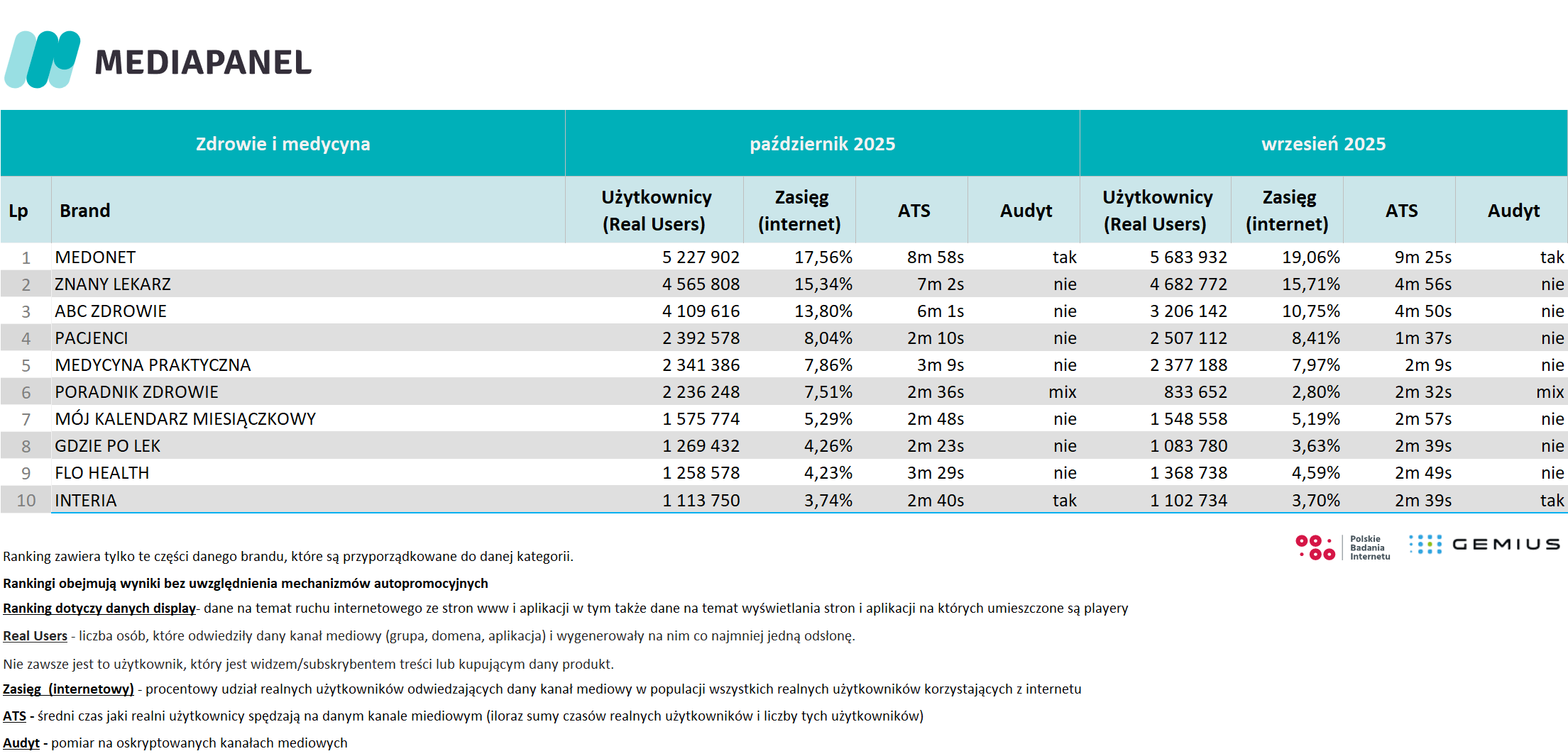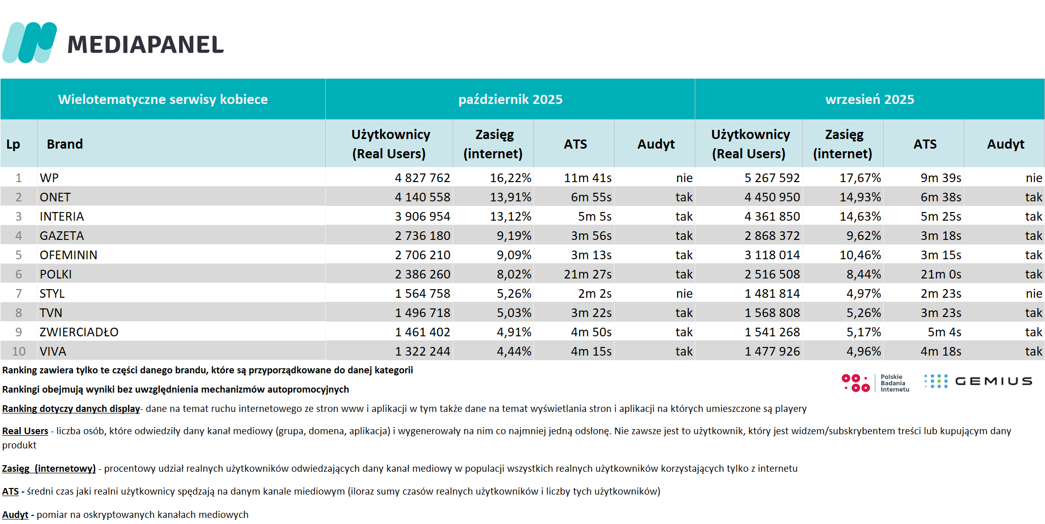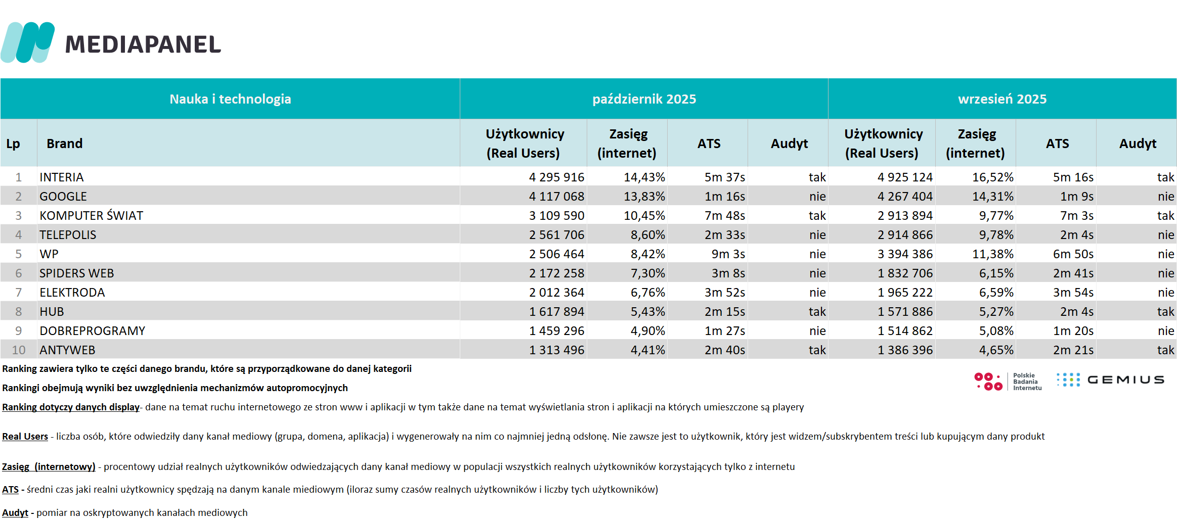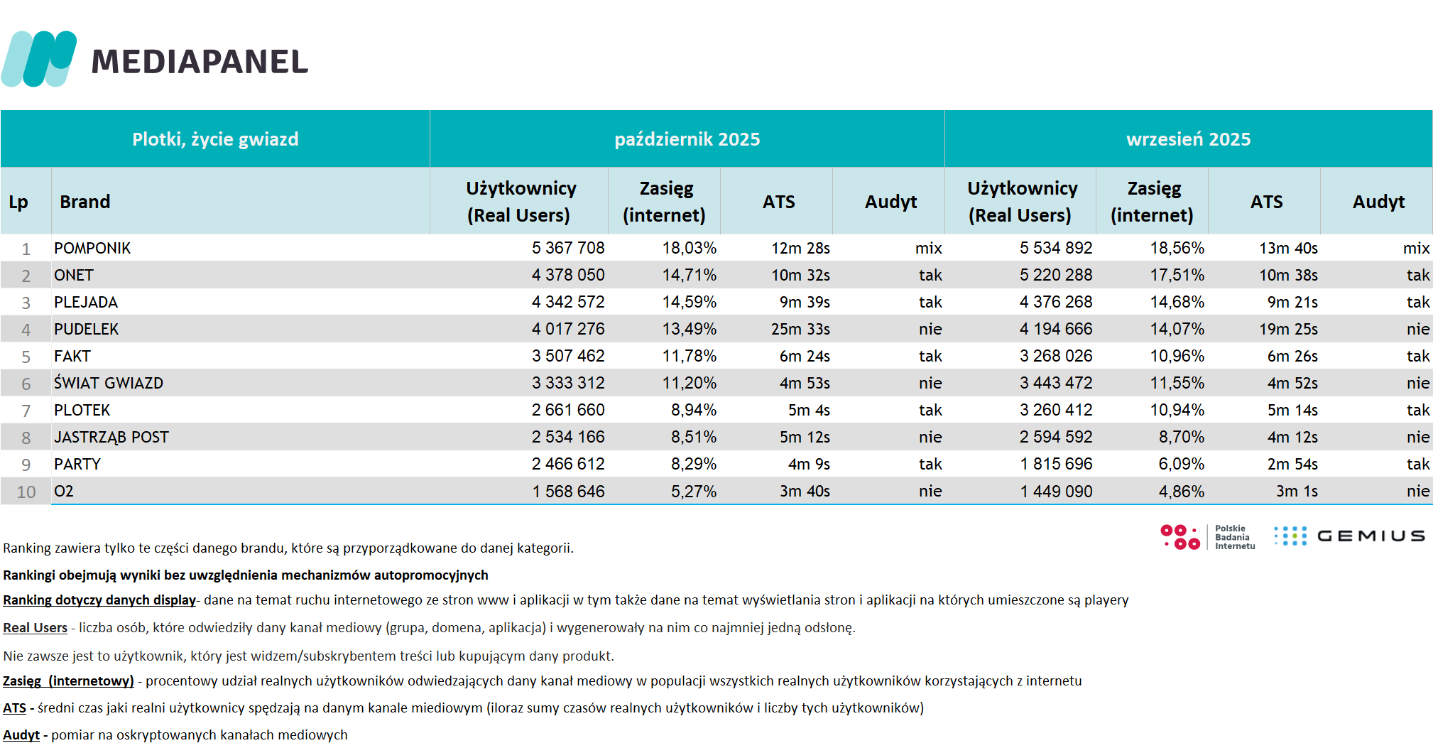 Udostępnione rankingi obejmują wyniki bez uwzględnienia stosowanych przez Wydawców mechanizmów autopromocyjnych, czyli np. mechanizmu "swipe-back" lub przenoszenia użytkownika po wylogowaniu z poczty na stronę inną niż strona logowania.