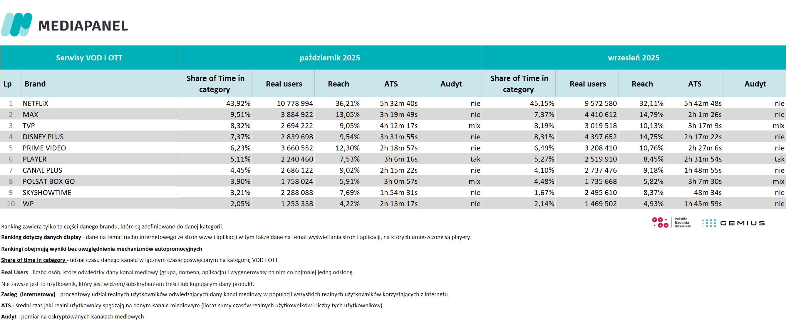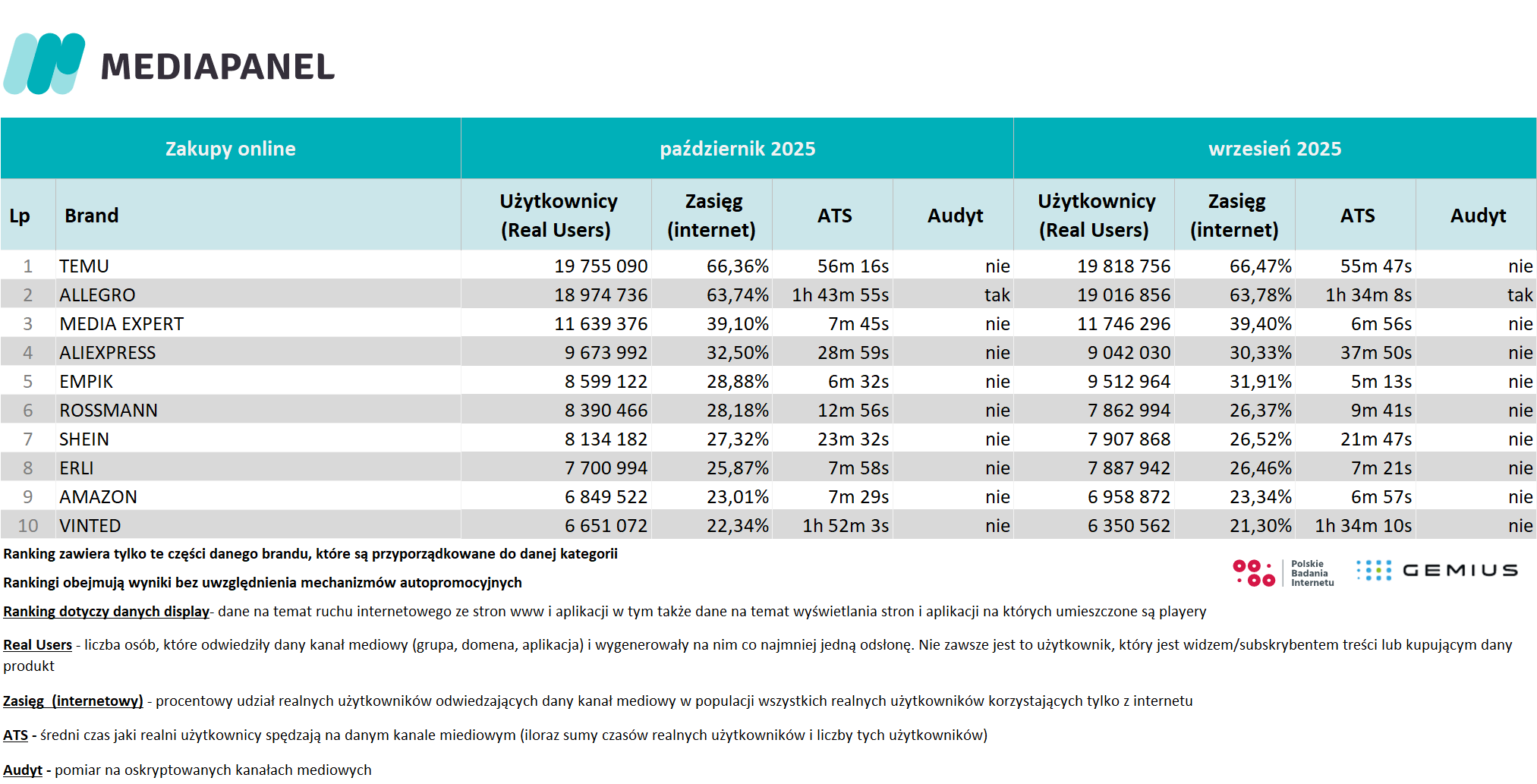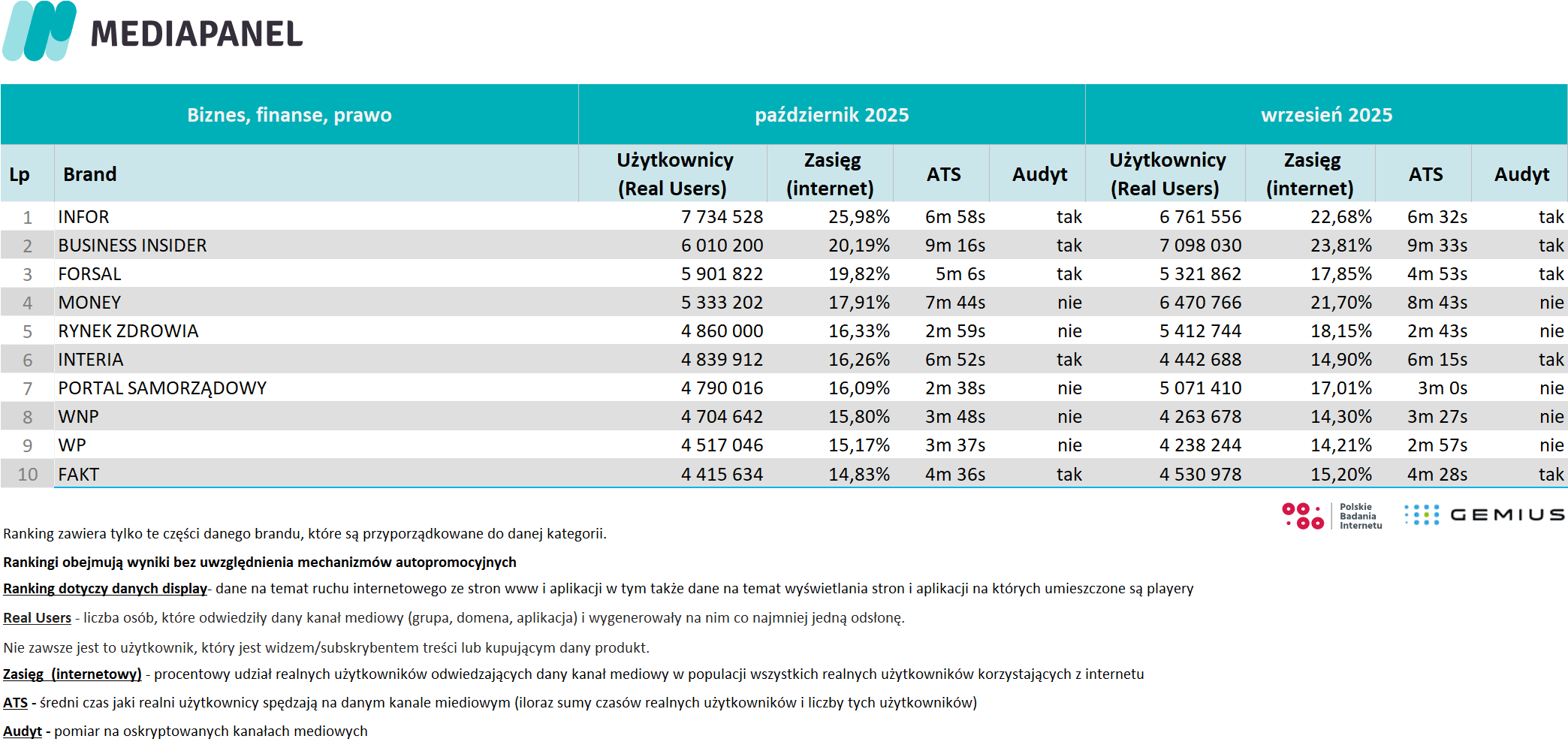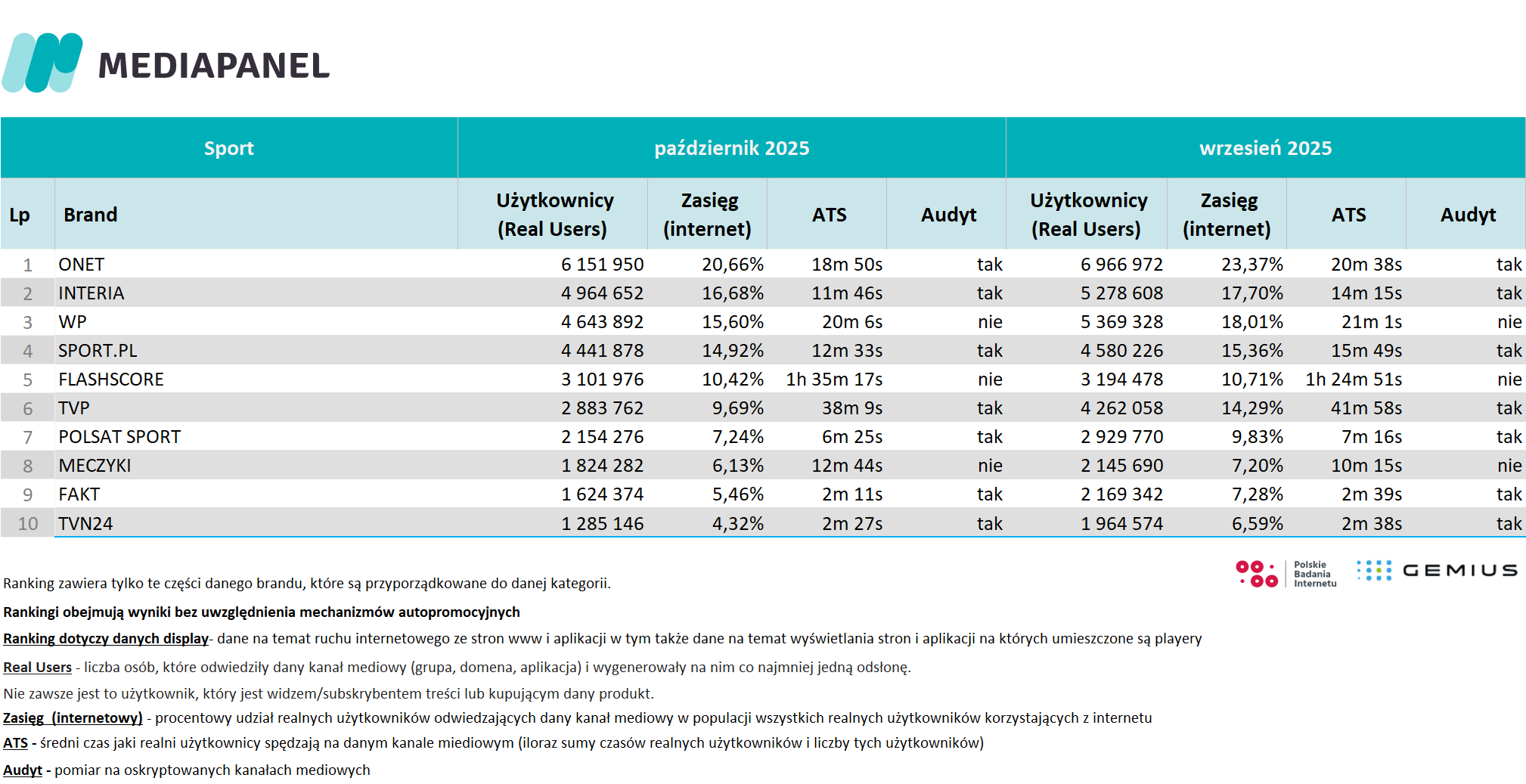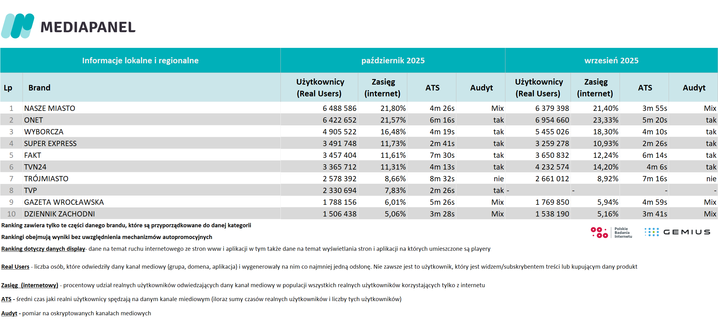 Udostępnione rankingi obejmują wyniki bez uwzględnienia stosowanych przez Wydawców mechanizmów autopromocyjnych, czyli np. mechanizmu "swipe-back" lub przenoszenia użytkownika po wylogowaniu z poczty na stronę inną niż strona logowania.