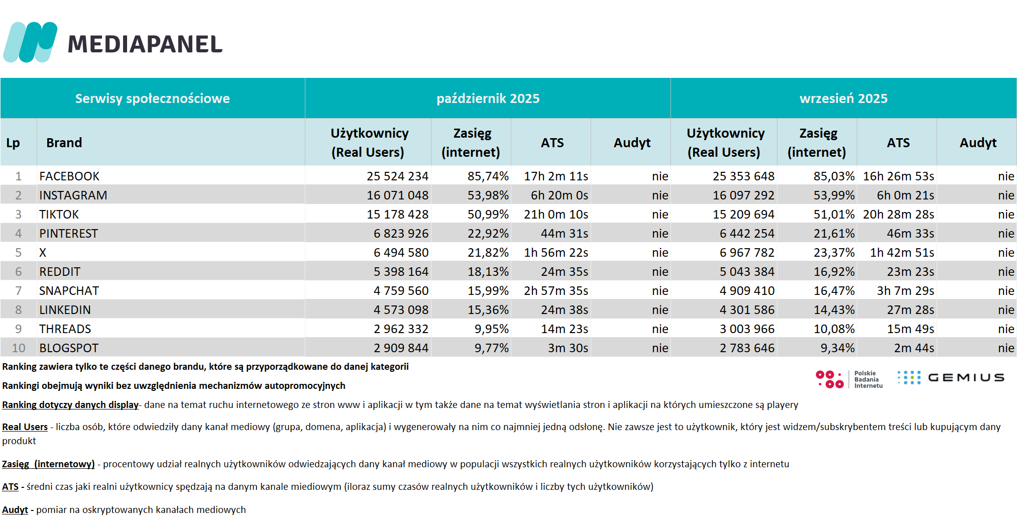 Wskaźnik "użytkownicy" (real users) oznacza liczbę osób odwiedzających daną stronę lub aplikację, nie zaś liczbę aktywnych użytkowników platform / serwisów czy też zarejestrowanych na nich kont.